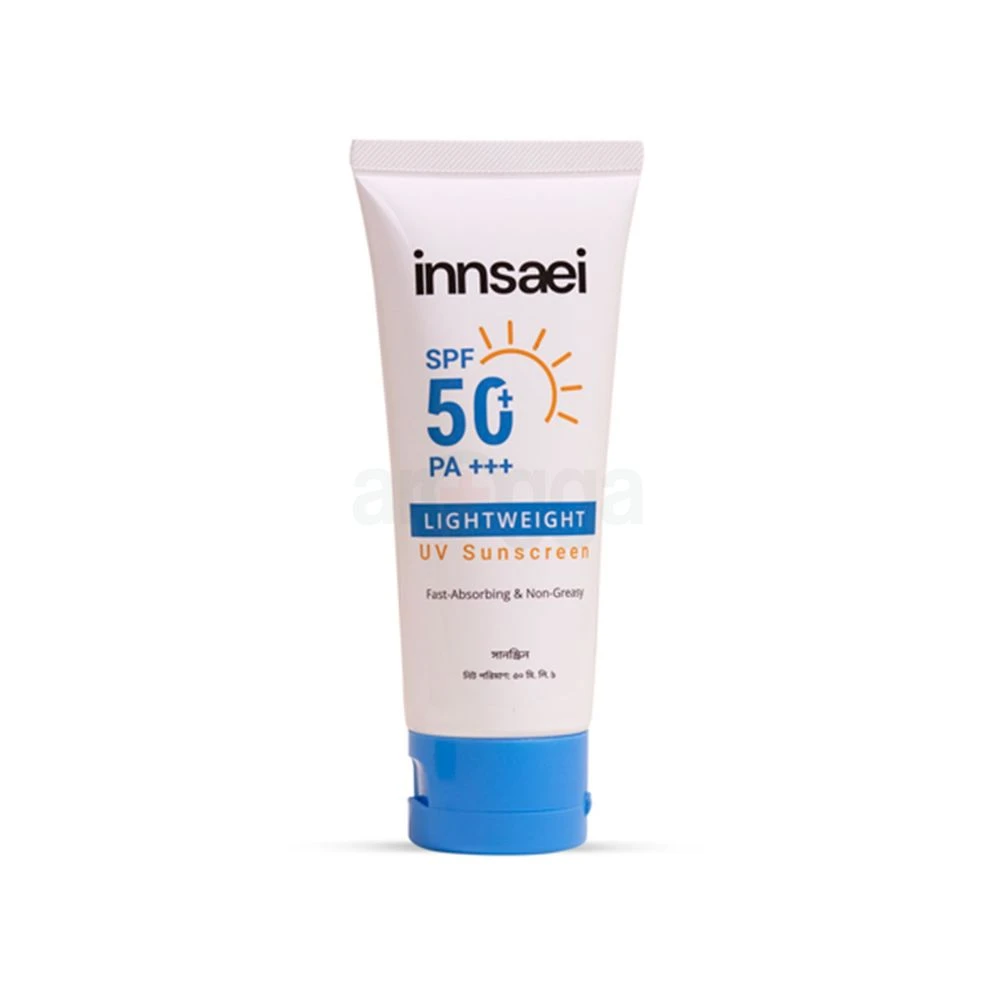 Protect your skin with Innsaei Lightweight UV Sunscreen 50ml, available at Jonopriyo.com.bd, the best skincare store in Bangladesh. This lightweight, non-sticky, and quick-absorbing sunscreen gives your skin broad-spectrum UVA & UVB protection while keeping it hydrated and smooth. Enriched with hyaluronic acid and soothing ingredients, it prevents sunburn, tanning, and premature aging. Perfect for daily use, whether under makeup or alone. Key Features